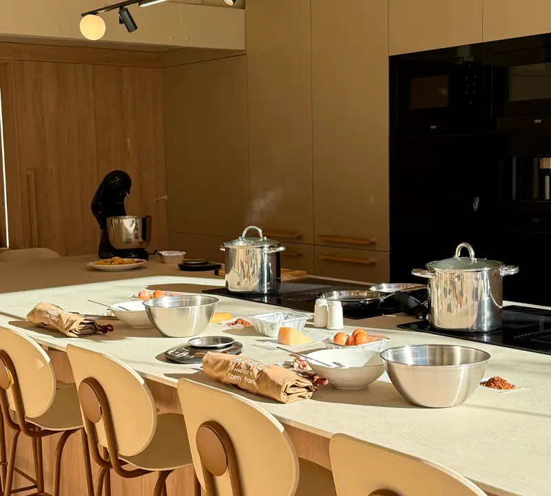 La estética también juega un papel clave en la experiencia. Los colores arena y beige aportan calidez y armonía, mientras que los electrodomésticos negros —sobrios, elegantes y modernos— crean un contraste que centra la atención en lo importante: los ingredientes, el fuego y el proceso de cocinar.