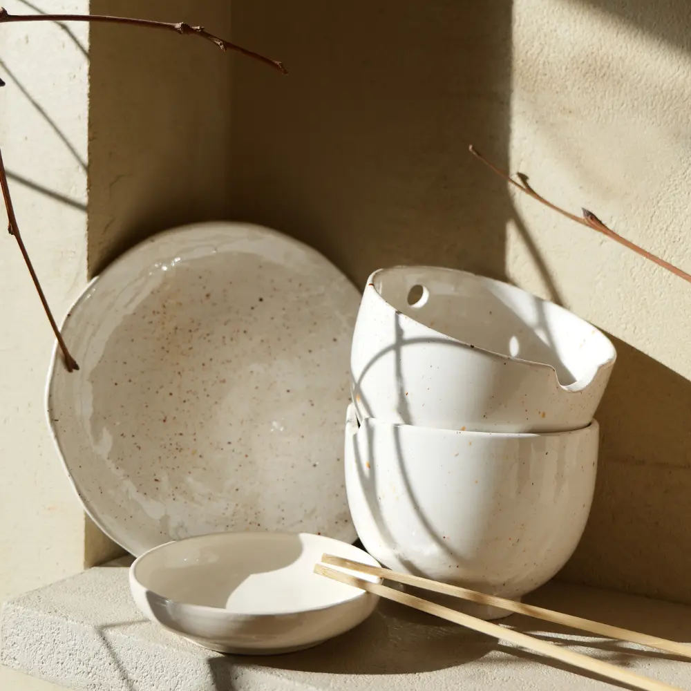 El pack incluye 2 bols de ramen de gran capacidad, 2 platos llanos y 2 cuencos para soja, formando un conjunto completo y armonioso para compartir comidas especiales en familia o con amigos.