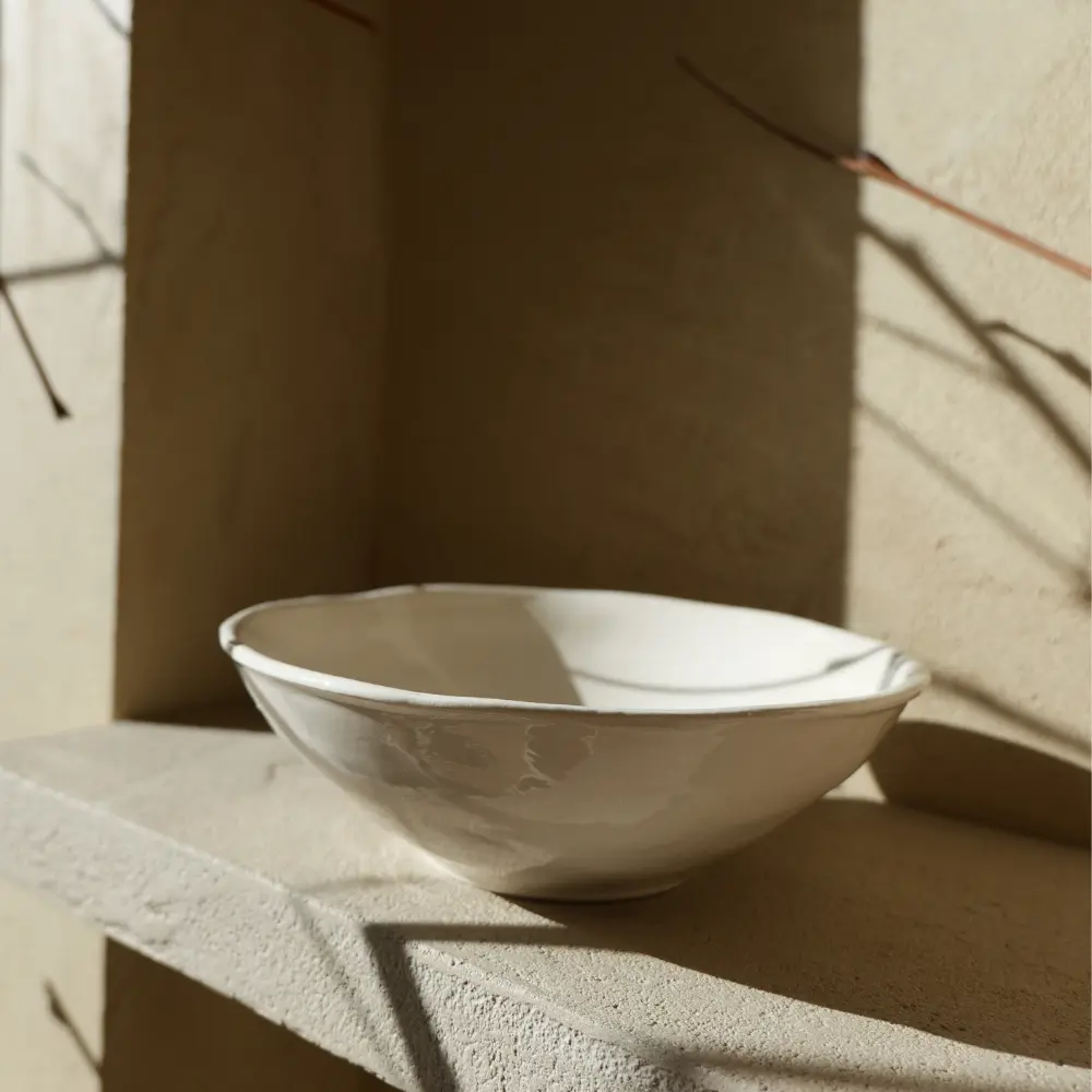 Su diseño orgánico e irregular transforma este plato hondo o bol en un imprescindible lleno de estilo. El acabado en blanco roto aporta calidez y naturalidad, realzando la presentación de sopas, ensaladas, guisos o postres.  Cada pieza es única, con ligeras variaciones propias del trabajo artesanal.