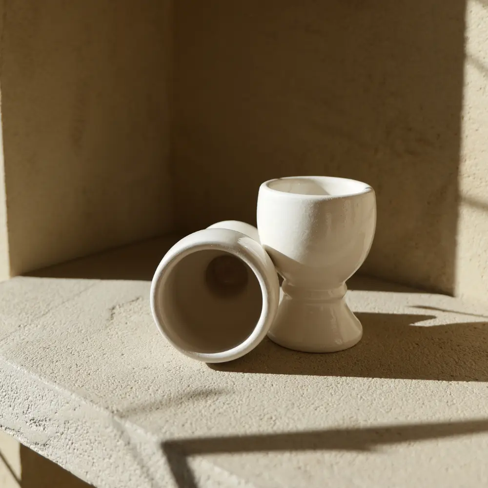Pequeño, práctico y con un diseño delicado, este porta-huevos aporta un toque elegante a tus desayunos y brunch. Su acabado blanco resalta la belleza del producto, presentándolos desde cocidos hasta pochados, o incluso pequeñas guarniciones. Cada pieza es única, con ligeras variaciones propias del trabajo artesanal.